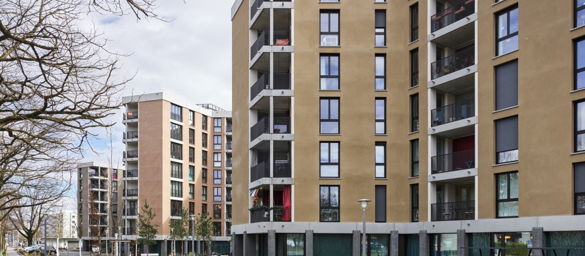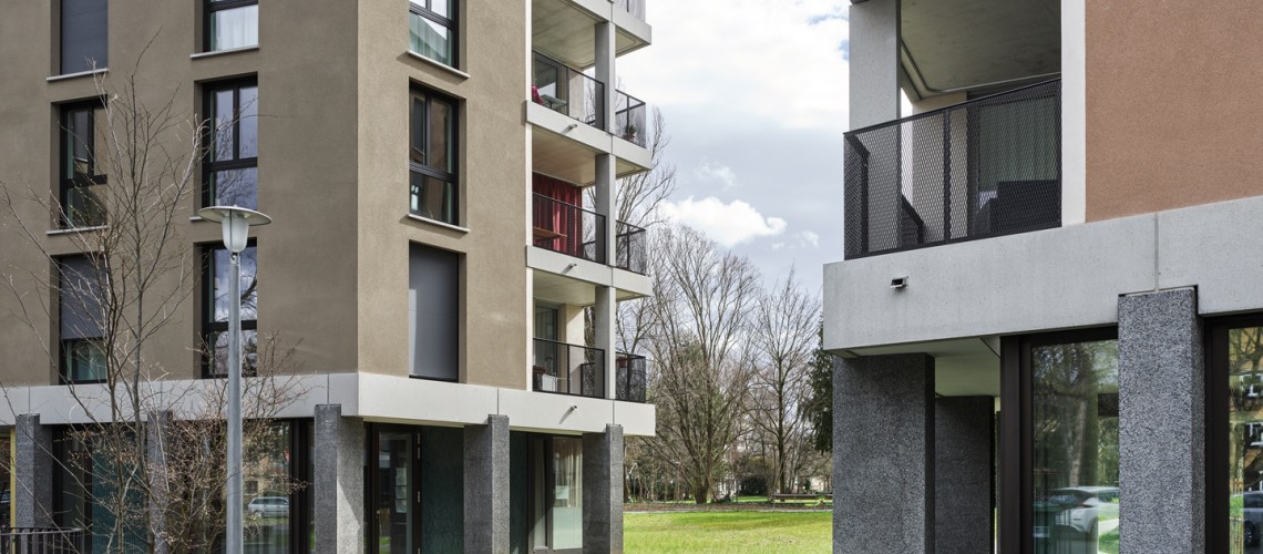 Bien que très dense, avec ses bâtiments de sept et huit étages, le nouveau quartier offre un vaste espace aux habitants : l’exemple parfait d’une densification réussie. Des points pour la durabilité dans le domaine de la société ont été attribués pour la mixité des affectations, un établissement médico-social, un local pour les jeunes et une crèche voisinant avec les appartements.