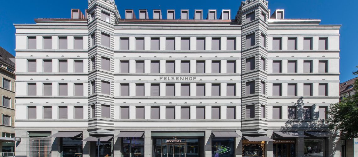 Le bâtiment Felsenhof, situé dans la Pelikanstrasse à Zurich, a été conçu en 1927 par l'architecte Hermann Weideli. Il était alors déjà affecté à des bureaux et des commerces. L’aménagement intérieur et les installations techniques ayant atteint la fin de leur cycle de vie, une rénovation complète a été planifiée. Le bâtiment, qui appartient aujourd'hui à Swiss Life, a été transformé en un espace contemporain et abrite désormais des bureaux attrayants et flexibles. Les lignes marquées et épurées du bâtiment, le rythme régulier des fenêtres et la sobriété de sa façade lui confèrent une présence structurée et bien ancrée.