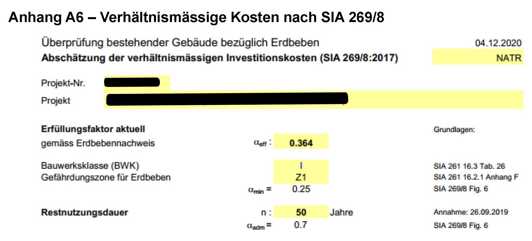 Beispiel Erneuerungen, Erdbebensicherheit: Berechnung der Verhältnismässigkeit der Kosten: