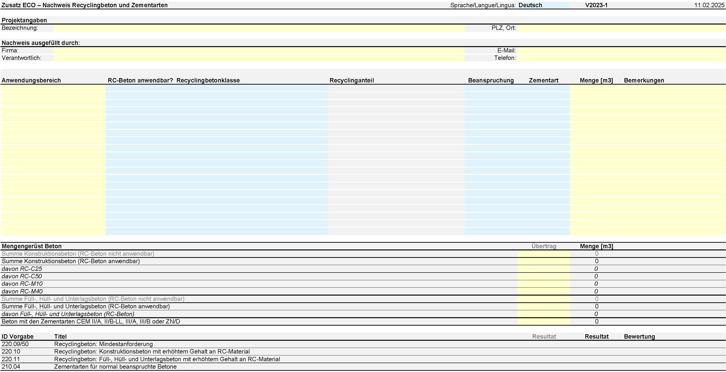 Illustration 3 : Document justificatif Excel vide de Minergie-ECO Recyclage du béton et des types de ciment