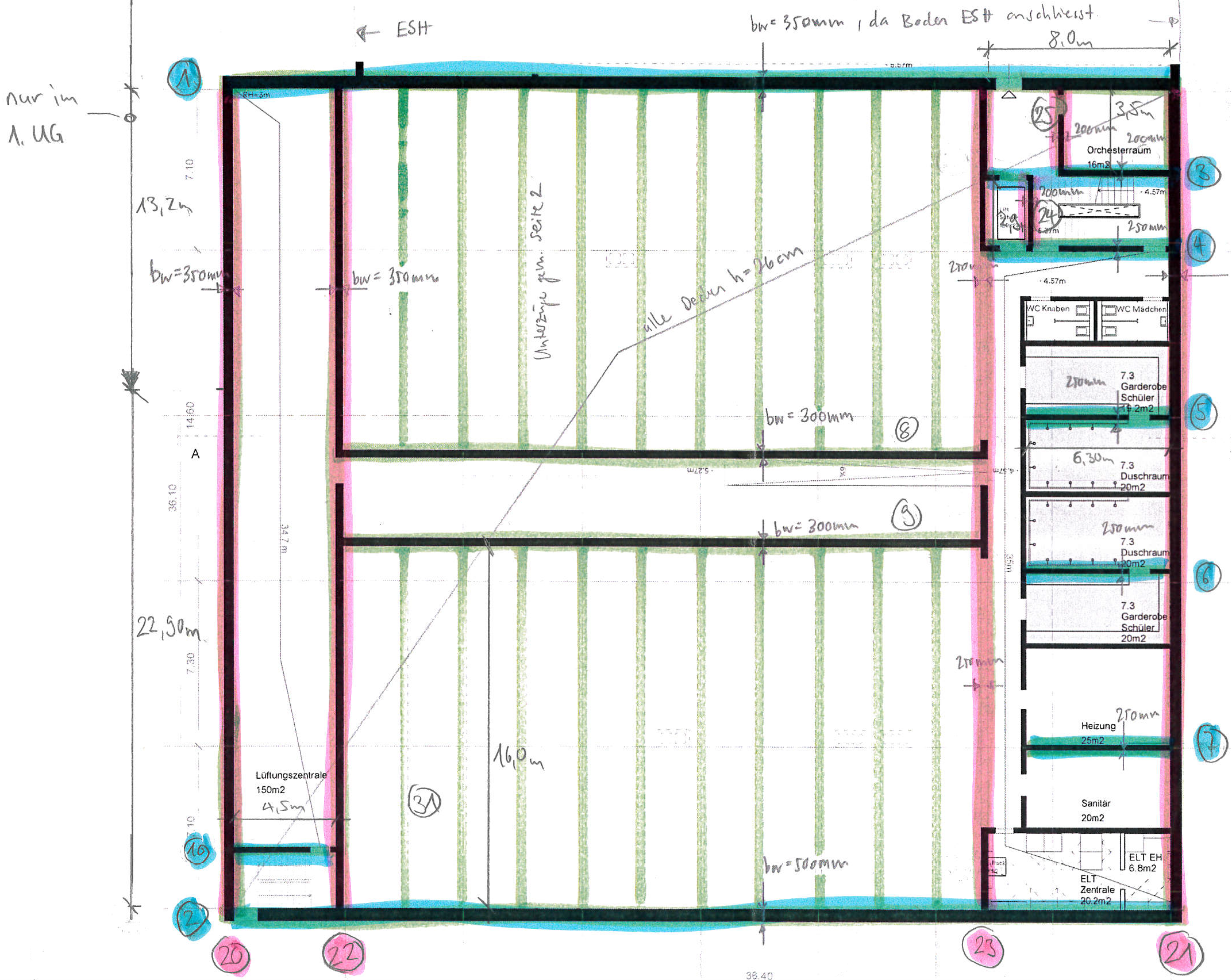 Illustration 2 : Plans d'exécution (plans et coupes) avec indications et marquage de la qualité du béton