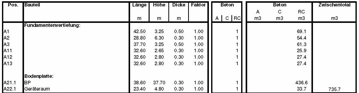 - Calcul compréhensible de la quantité totale de béton